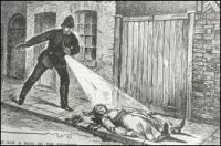 Как мы знаем, Джек Потрошитель охотился исключительно на проституток. Причем на самых грязных, убогих и отвратительных — из тех, что готовы на все "за стакан портвейна" (с учетом английской специфики — за пинту эля). Наиболее известной его жертвой стала некая Энн Чэпман. Почему? Может, потому, что в своих сорок семь эта миниатюрная женщина сумела сохранить приличную фигуру и былую привлекательность — голубые глаза не разучились сиять, да и зубы кое-какие во рту еще остались. А возможно, просто потому, что именно после ее жуткого убийства (Энни стала второй на кровавом пути Джека) в Ист-Энде по требованию общественности установили первые фонари... Тело Энни Чэпман нашли ранним утром 8 сентября на заднем дворе дома № 29 по Хенбери-стрит. Голова ее была практически отделена от тела, а все, что находи-лось ниже пояса, садист превратил в сплошное кро-вавое месиво. Осматривавший труп патологоанатом утверждал, что для нанесения ранений убийце пришлось "трудиться" никак не меньше пятнадцати минут — при условии, что жертва вообще не сопротивлялась.