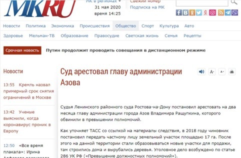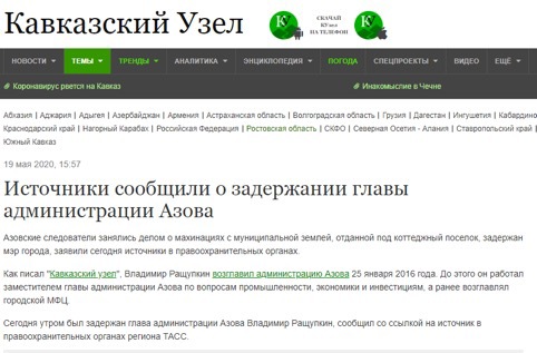 Так, в материалах частного расследования (https://azovskiykuklovod.com) по аресту мэра Азова подробно разобрана суть происходящего, межрайонный прокурор пытался реализовать план по захвату контроля над городом, и костью в горле стал глава Ращупкин, не пожелавший участвовать в прокурорских схемах.