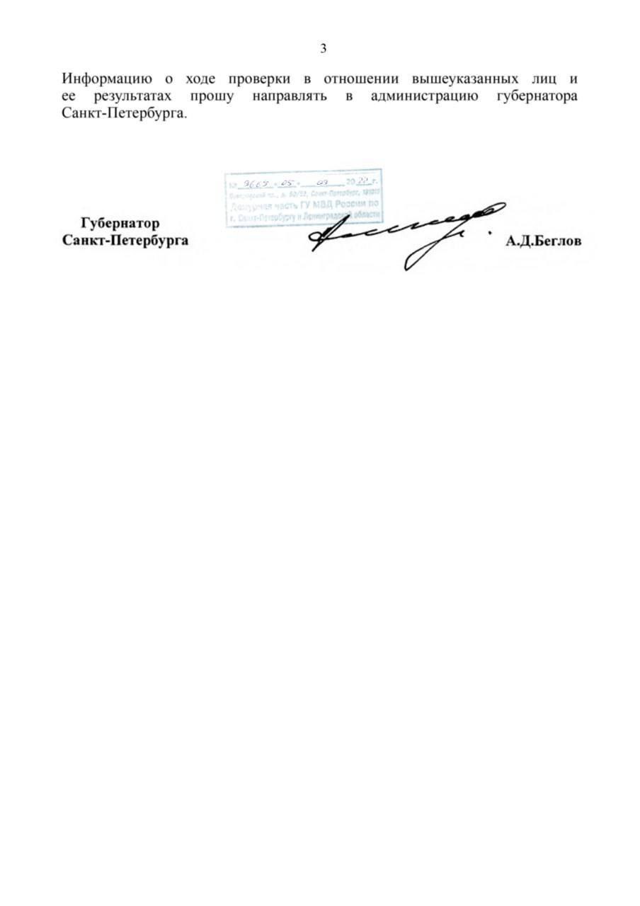 Так, в сеть просочилась копия заявления, написанного на имя главы ГУВД по Санкт-Петербургу и Ленинградской области Романа Плугина. Беглов требует проверить материалы с критикой его работы и главных редакторов изданий эти статьи разместивших. В заметках раскрываются предположительные коррупционные схемы приближенных губернатора и людей, которые могут быть с ним связаны в различных сферах бизнеса — строительство, торговля, сфера социального питания.