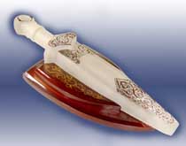 Это “Исаакиевский собор”, “Кинжал” (на снимке), “Корона” и “Сани”, изготовленные на “Северном Рейде”. Кроме того, “Исаакиевский собор”, “Кинжал”, “Корона” и “Сани отмечены специальными золотыми знаками. Всего в выставке приняли участие 74 предприятия из 27 регионов Российской Федерации, Украины, Беларуси и Грузии. На конкурс было представлено 206 видов продукции, из которых 168 видов продукции были удостоены Золотого Знака качества, 28 - Серебряного Знака качества и 8 - Бронзового Знака качества.
