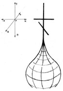 и правилами в качестве образца для других. Особенности вероисповедания — это еще и культура народа и традиции. Но если посмотреть математически, то опять-таки совершенно очевидно, что в православной символике как раз и дан образ синтеза геометрического и алгебраического. Ведь совершенно очевидно: символы Православия объемны: шарообразный купол церкви перетекает в навершие, представляющее собой некий “вогнутый конус” — это сфера мнимого радиуса кривизны, а увенчивает все трехмерный пространственный крест, ведь наклонная перекладина являет собой плоскую проекцию отрезка, перпендикулярного двум другим. Кстати, она проходит через другую точку — в отличие от стандартной системы декартовых координат. И математически это является фундаментальным отличием, которое только сейчас становится понятно науке. В другом варианте устройства купола основой является тор, “калач”, — это еще более сложное топологическое построение.