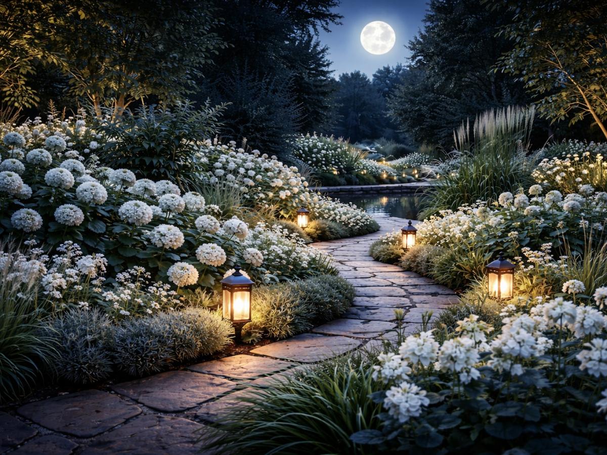 Однако это не строгое правило. Белые растения отлично работают и в полутени, визуально "подсвечивая" тёмные зоны днём. В затенённых уголках лунный эффект можно усилить с помощью садового освещения, используя мягкий рассеянный свет.