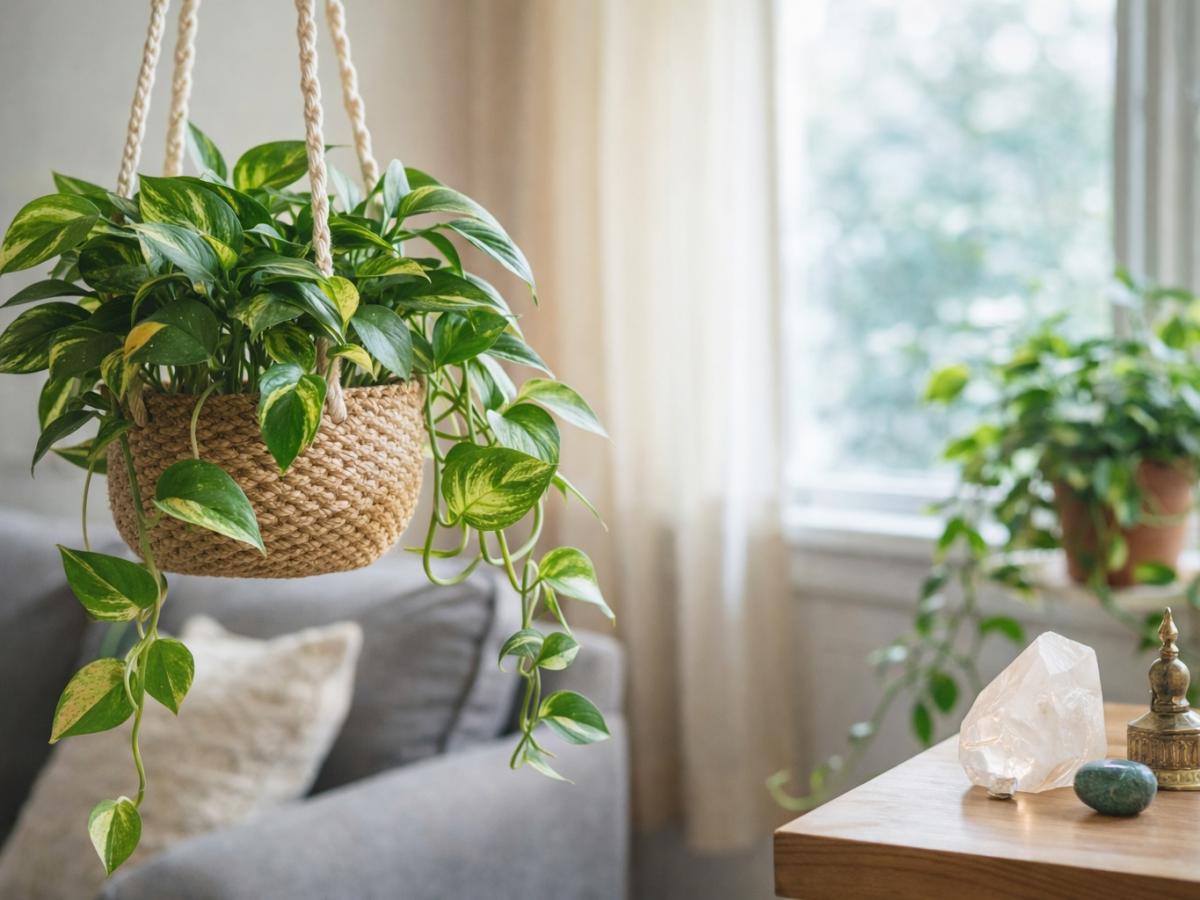 В гостиной потос часто размещают в углах, где энергия может застаиваться. Ниспадающие побеги визуально смягчают пространство и поддерживают баланс, особенно если рядом находятся растения с округлыми листьями, например содержание сансевиерии дома.