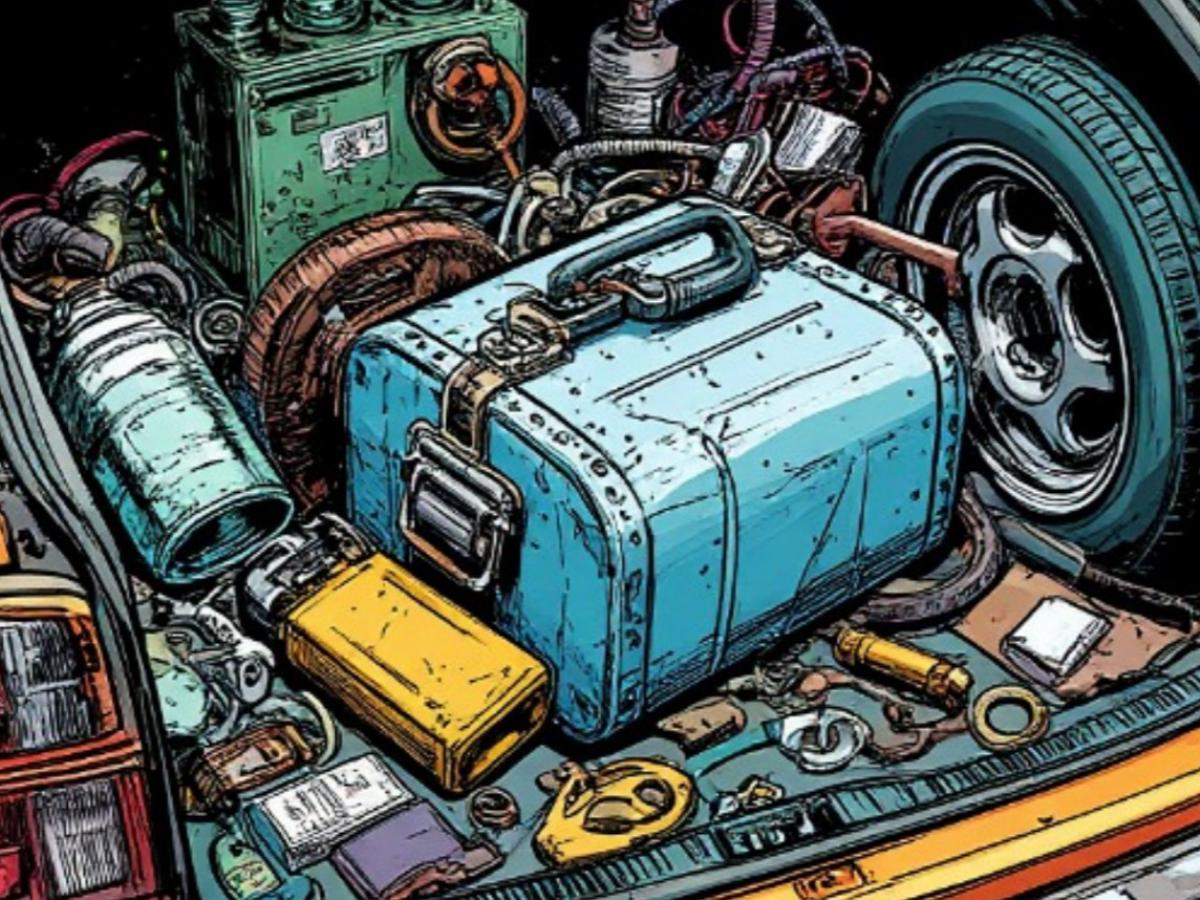 Багажник советской машины — это была настоящая капсула выживания. В ней лежало всё, чтобы починиться, согреться, перекусить и дотянуть до цивилизации.