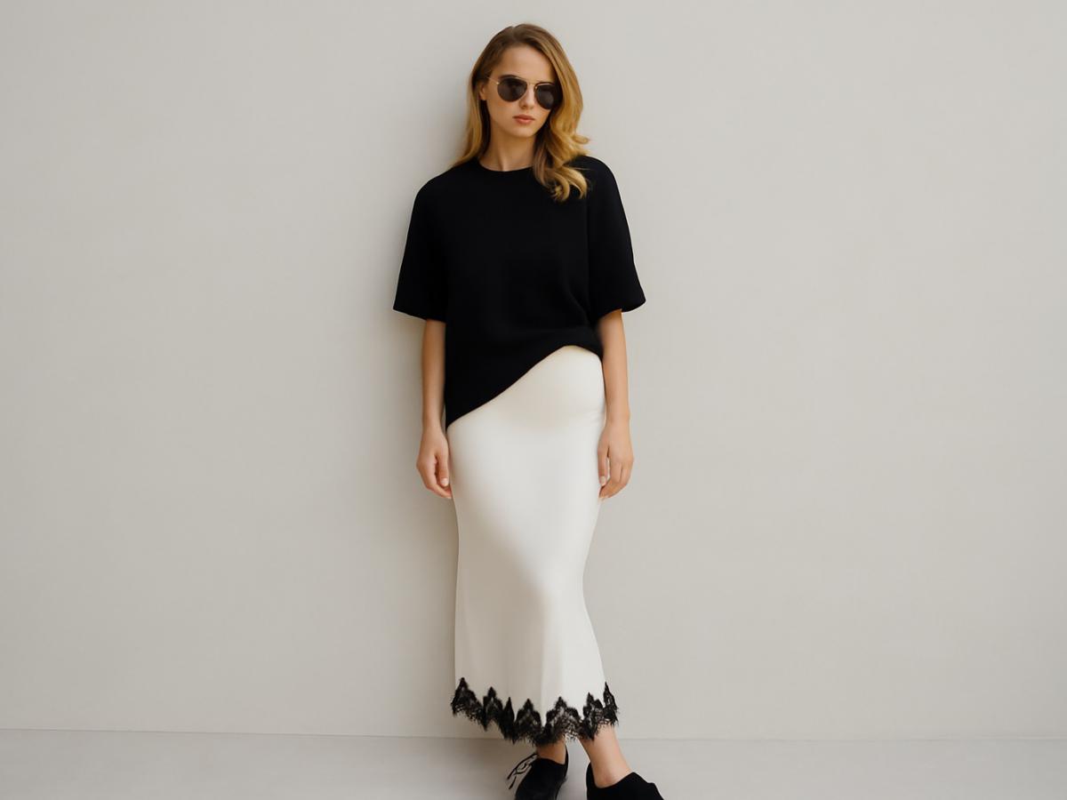 Про силу без громких слов — струящаяся юбка, oversize-рубашка, небрежно заправленная с одного края, немного золота и лёгкий намёк: мне хорошо с собой, но возможно — и с тобой.