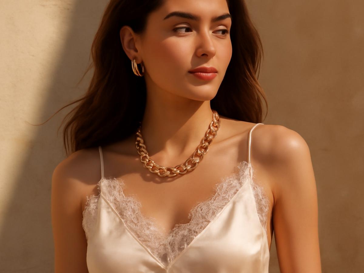 Тонкие цепочки в несколько рядов отвлекают внимание от шеи и нижней части лица, визуально смягчая линии. Особенно эффектно смотрятся золотистые варианты, которые добавляют сияние коже и делают наряд изысканнее.