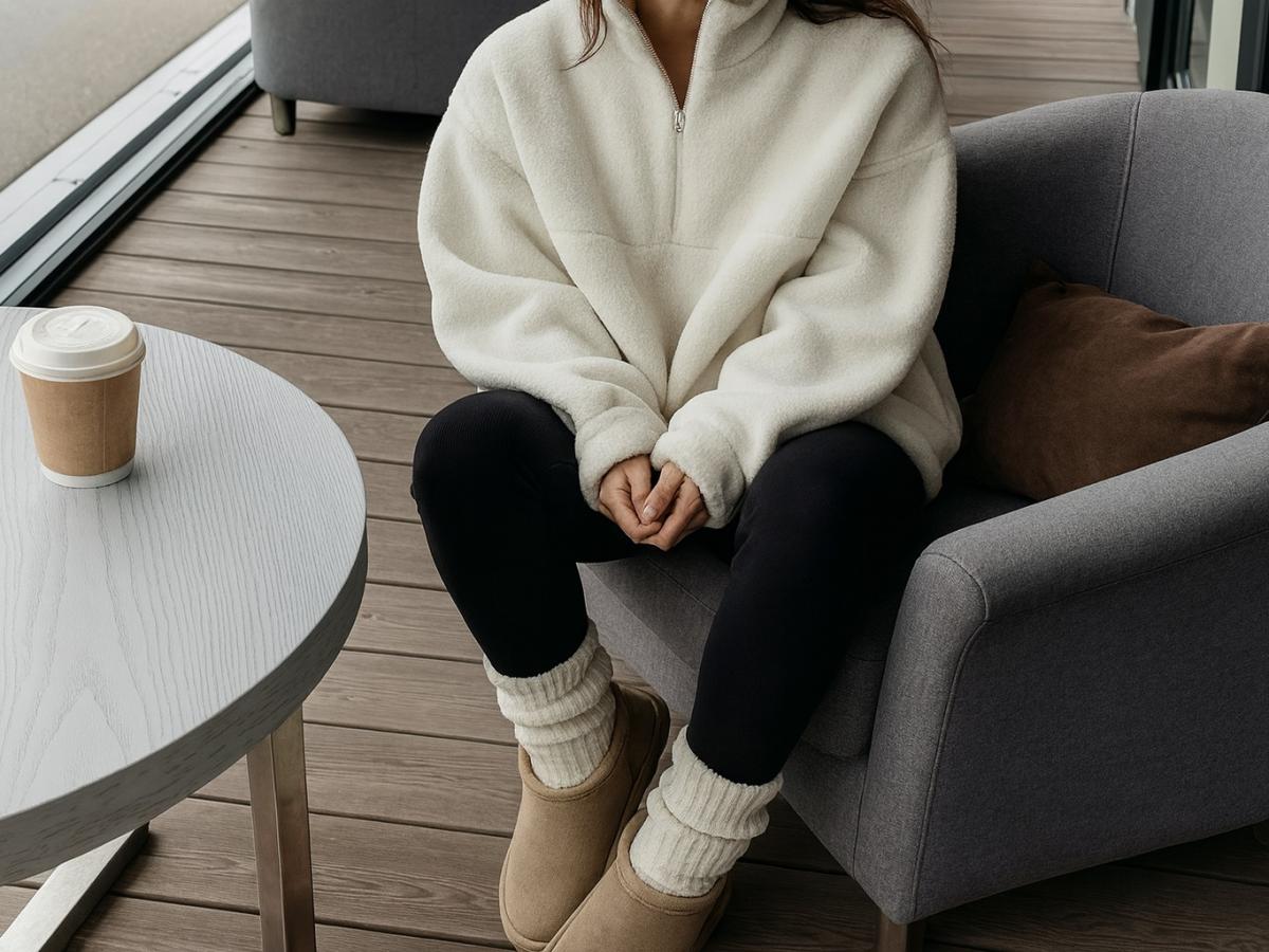 Для уютного образа зимой добавь угги, шерстяные носки и объёмный свитер.