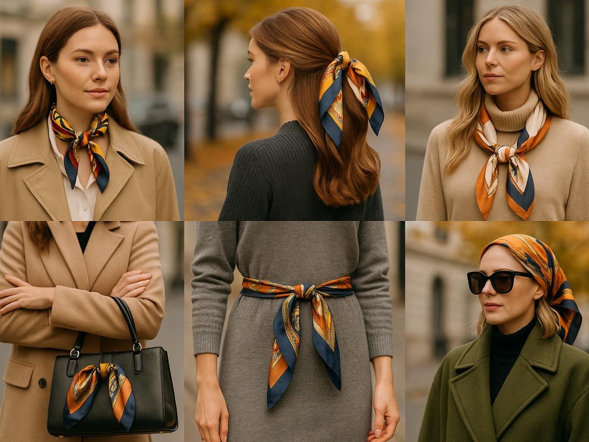 Лучшие материалы для повседневного ношения — плотный шелк, тонкая шерсть или кашемир. Они держат форму и при этом приятны к телу. Маленькие каре теперь чаще носят как аксессуар: на ручке сумки, на хвосте или запястье. Крупные платки, наоборот, придают образу статусность, позволяют экспериментировать с драпировкой и создают ощущение роскоши.