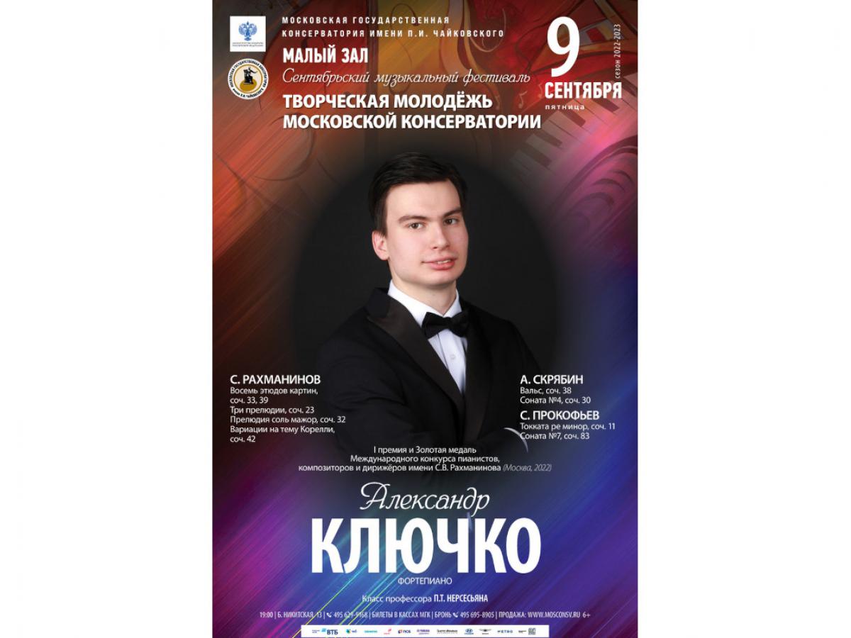 9 сентября в 19:00 в Малом зале Московской консерватории в рамках традиционного сентябрьского фестиваля "Творческая молодёжь Московской консерватории" состоится концерт Александра Ключко (фортепиано).