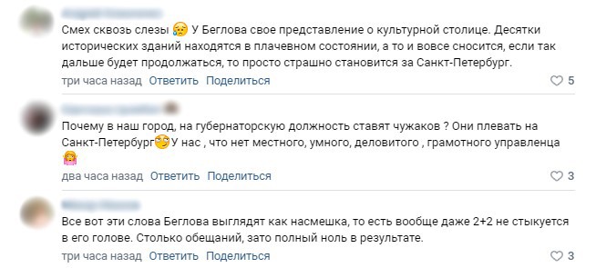 Горожане задаются вопросом, почему губернаторскую должность в Петербурге занимает "чужак", ведь среди местных, уверены комментаторы, можно найти "умного, деловитого и грамотного управленца". А все заявления нынешнего градоначальника, считают петербуржцы, выглядят как насмешка — столько обещаний и "полный ноль в результате".