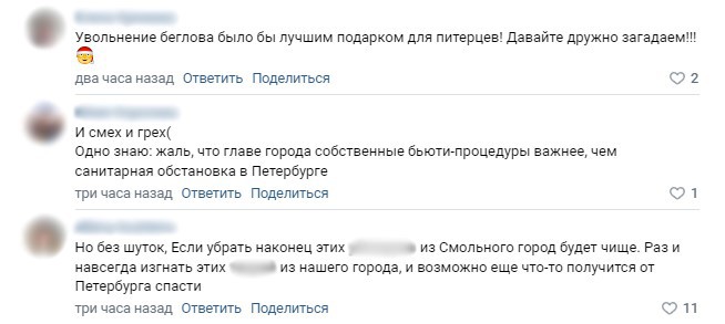 Также горожане заявляют, что лучшим подарком для петербуржцев станет увольнение Беглова с занимаемой должности, и предлагают дружно загадать соответствующее желание. Некоторые пользователи убеждены, что город действительно станет лучше, если принять масштабные кадровые решения в отношении чиновников Смольного. Только так, считают местные жители, еще можно спасти Петербург.