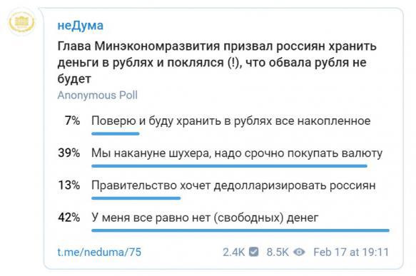 По данным опроса, проведенного публичным каналом в Telegtam "НеДума", 42% опрошенных россиян ответило, что у них нет денег, а 39% считает, что "мы накануне шухера, надо срочно покупать валюту".