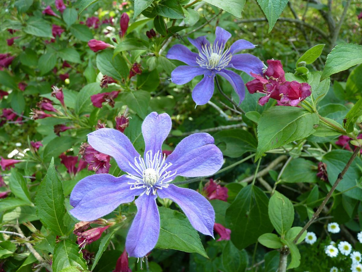 Еще одним вариантом с прекрасным цветением несколько раз в сезон является клематис «Ниобе». Его окраска варьирует от гранатовой по краям до почти черной в центре, что придает цветам особую загадочность и привлекательность.