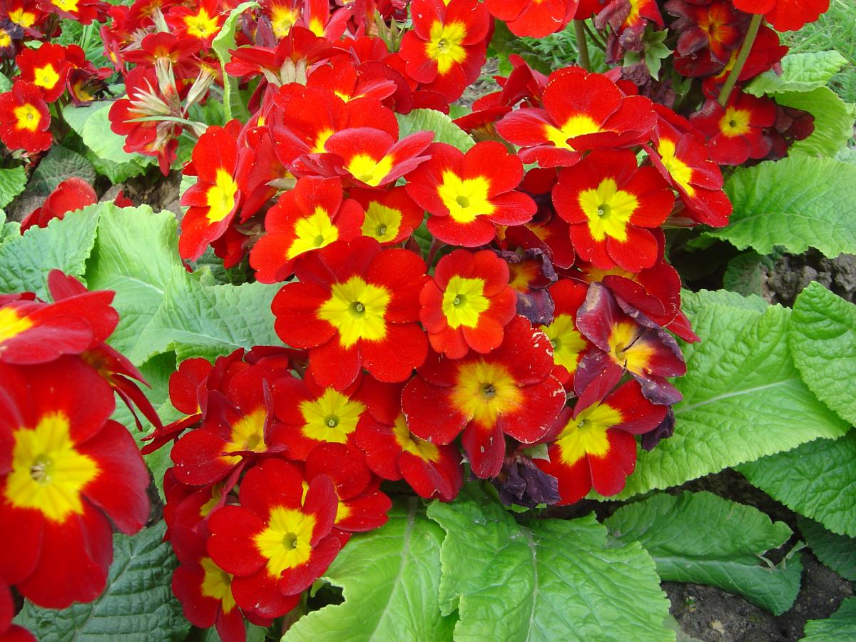 Для создания красочных композиций на клумбе можно сочетать несколько сортов примулы, сохраняя расстояние между кустиками от 10 до 30 см.