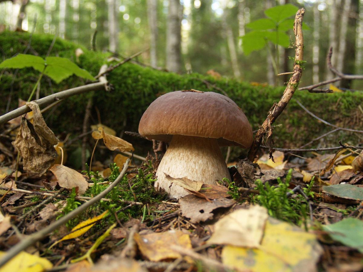 Поиск грибницы. Чтобы вырастить белые грибы на даче, необходимо найти взрослый белый гриб в лесу и аккуратно извлечь грибницу, не повредив её.