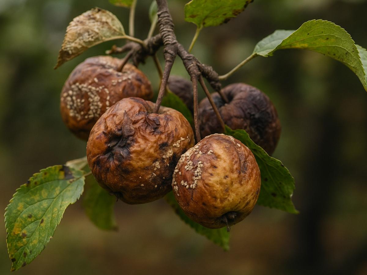 Монилиоз — это грибковая инфекция, поражающая плоды и побеги. Первые признаки — бурые пятна на яблоках, грушах и других плодах. Пятна постепенно увеличиваются, на их поверхности появляются белые кольца спор. Со временем мякоть темнеет, плод размягчается и осыпается или остается висеть на ветке в виде "мумифицированного" остатка.