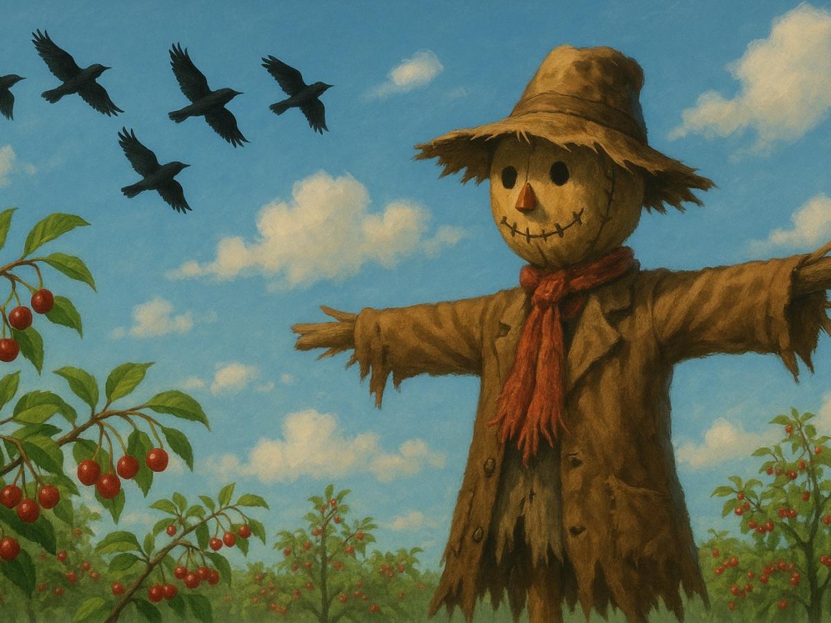 Пугало — не просто символ деревенского сада, а проверенное средство. Его можно сделать из подручных материалов: старой одежды, палок и соломы. Еще лучше, если оно будет двигаться или издавать звук. Альтернатива — обманки в виде хищных птиц: фигурка совы, ястреба или воздушный змей с реалистичным рисунком. Главное, периодически менять их положение, чтобы птицы не привыкали.