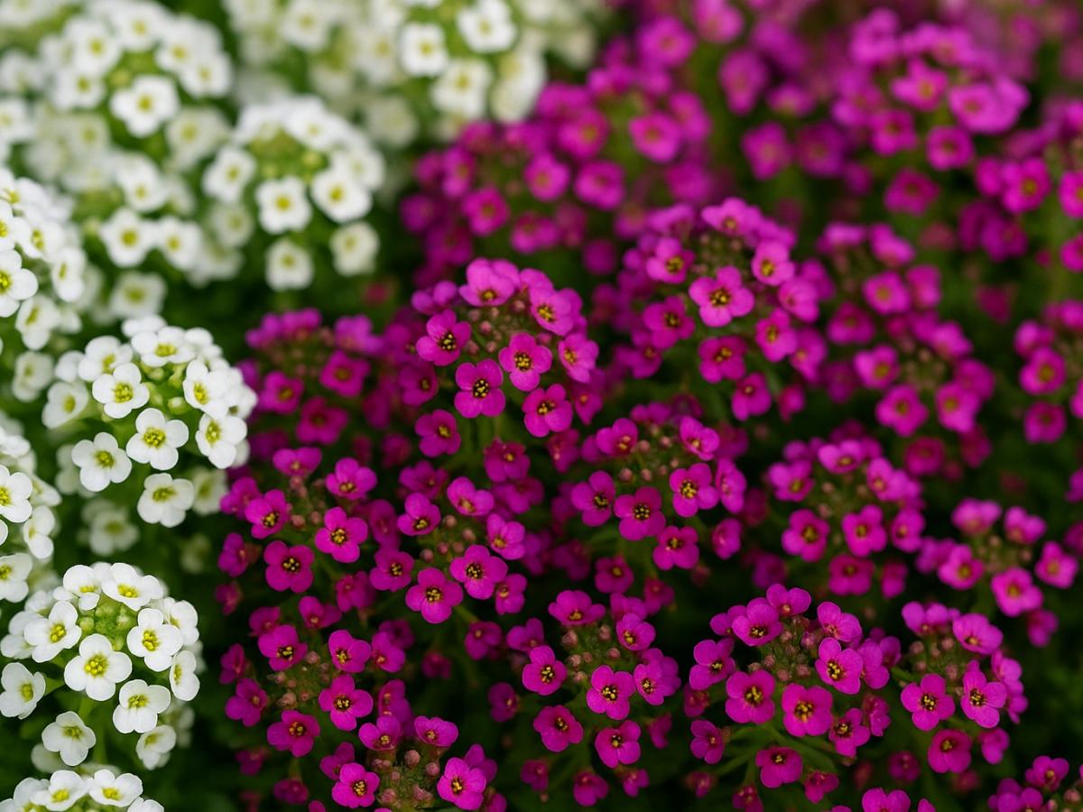 Алиссум, или бурячок, покоряет своим сладким медовым ароматом. Его золотисто-кремовые цветки образуют густое соцветие, которое почти полностью скрывает листья. Растение любит солнце и прохладу, спокойно переносит похолодание и цветет до поздней осени. После обрезки быстро восстанавливается и продолжает выпускать новые бутоны. Алиссум особенно хорош в бордюрах и подвесных кашпо, где создаёт эффект цветущего облака.