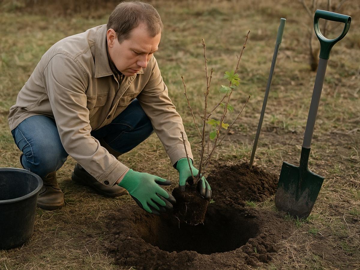 В лунку внесите органику и разрыхлитель (раскисленный торф, компост, перегной), корни аккуратно расправьте, заглубляйте до корневой шейки (красную смородину можно чуть глубже).