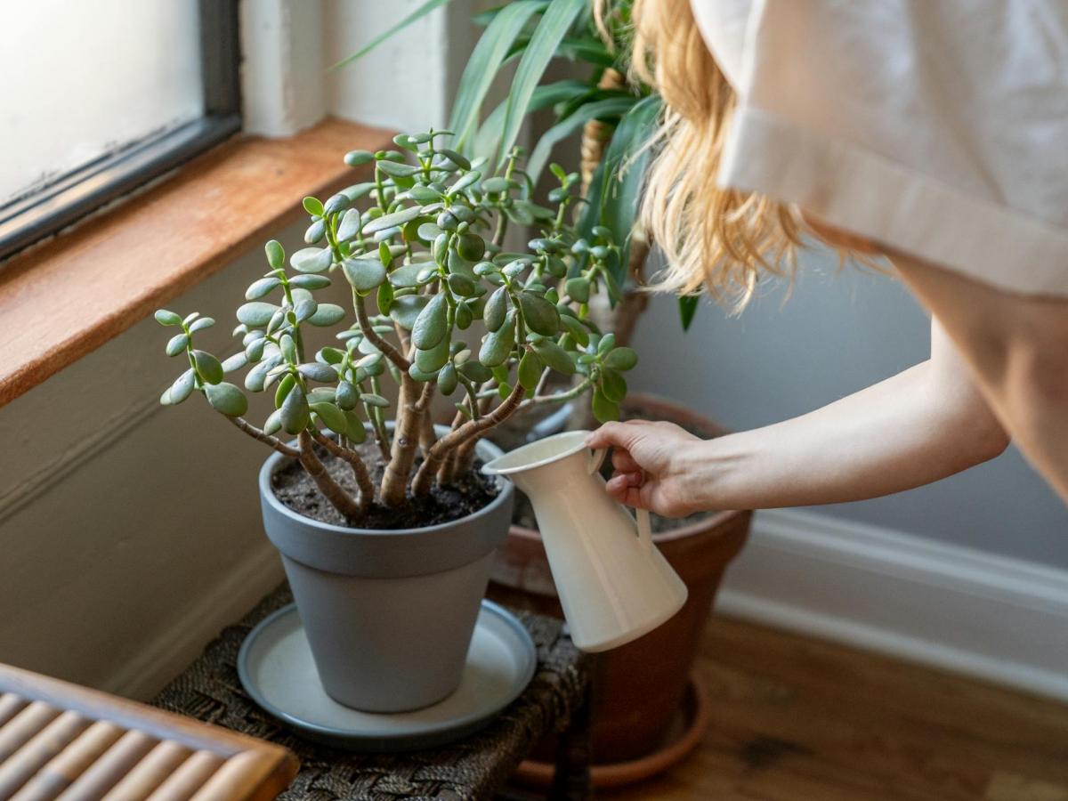 Поставьте горшок на подоконник с ярким рассеянным светом. Поливайте умеренно — только когда подсохнут верхние 6 мм почвы. У суккулентов главное правило простое: лучше чуть недолить, чем перелить, особенно если есть риск трещин на стволе денежного дерева.