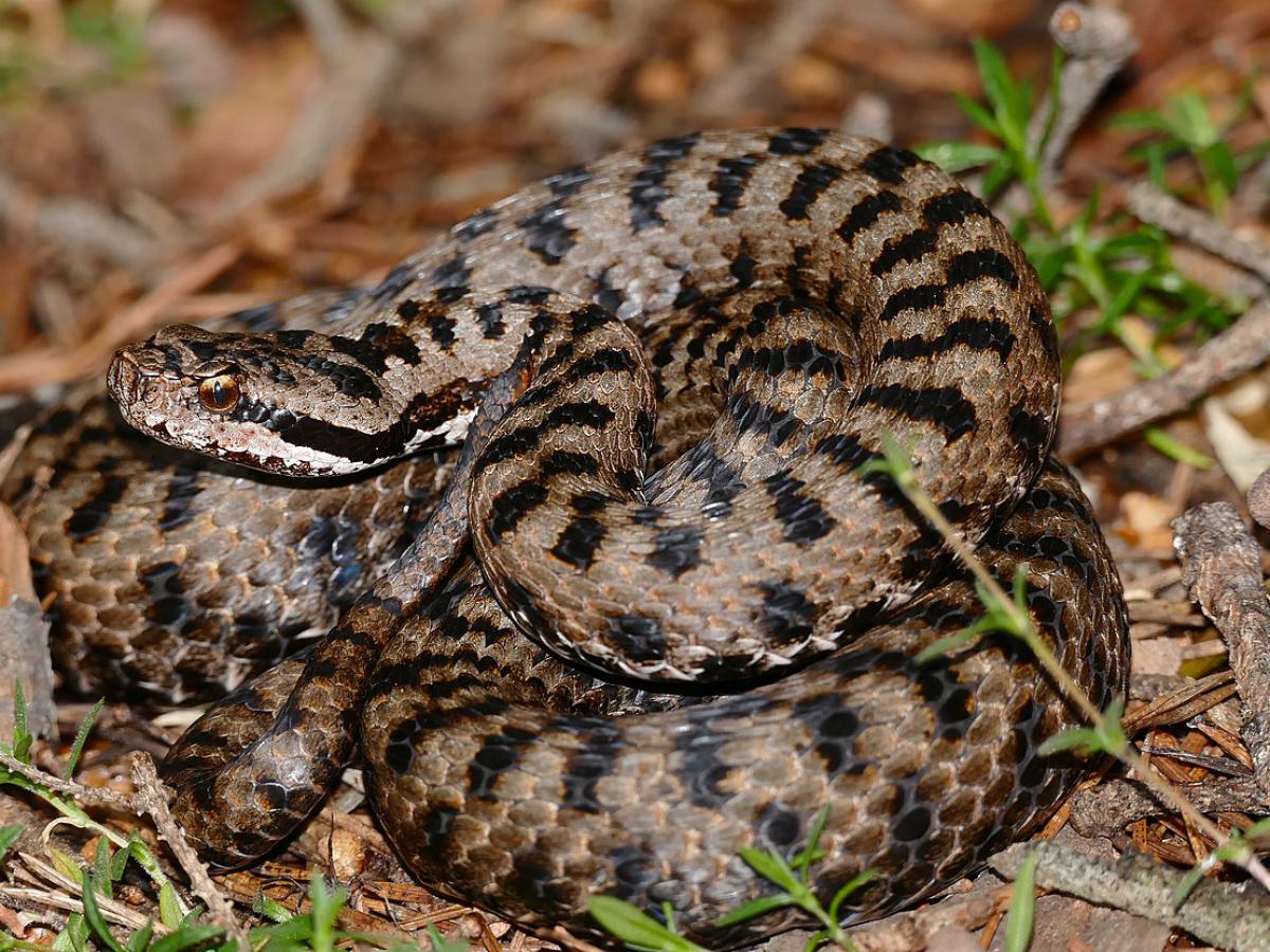 Обыкновенная гадюка: единственная ядовитая. До 70 см длиной, с зигзагом на спине, опасна только при угрозе.