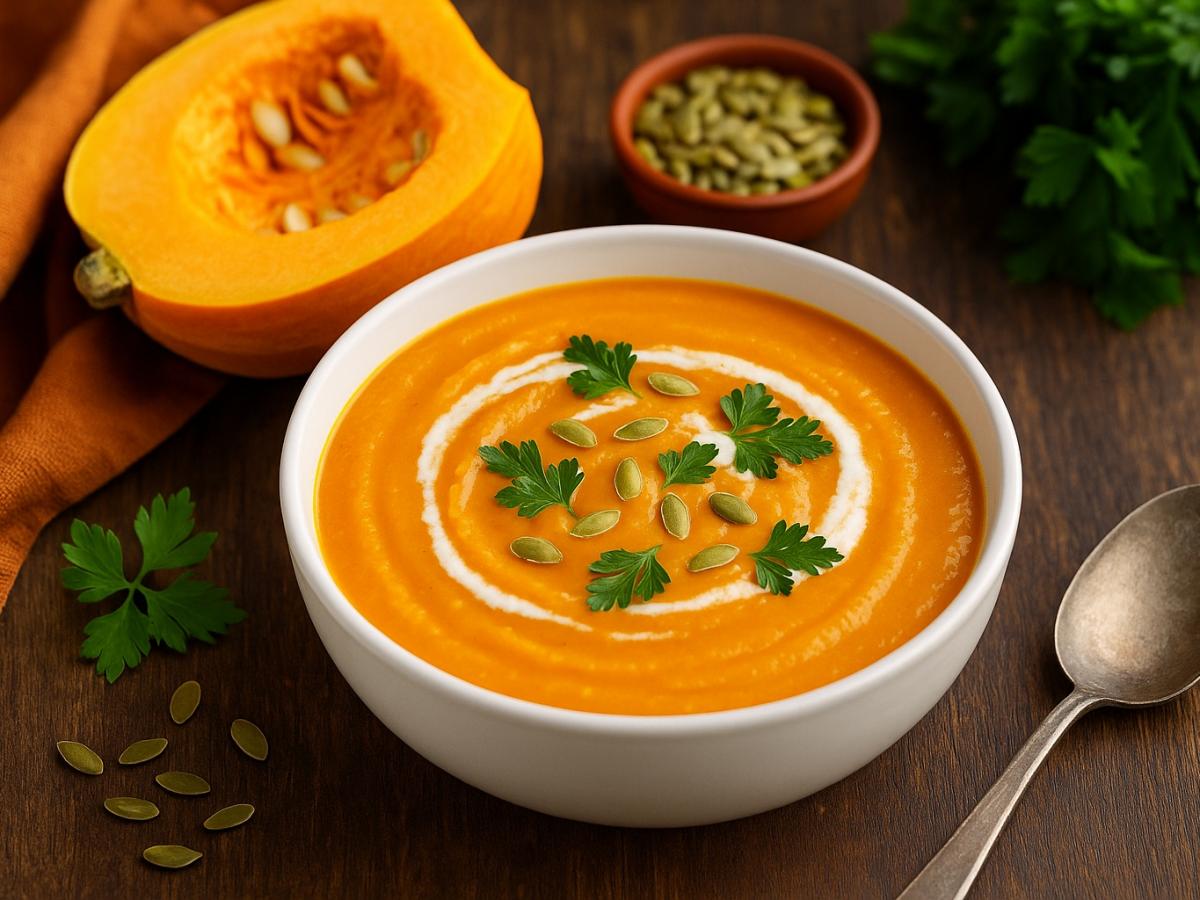 Тыква — настоящий кладезь витаминов и минералов. В ней содержатся витамины А, Е, С, группы В, железо, калий, магний и клетчатка. Эти вещества поддерживают иммунитет, укрепляют сердце, улучшают обмен веществ и состояние кожи. Особенно ценен бета-каротин - природный антиоксидант, придающий мякоти ярко-оранжевый цвет и защищающий клетки от старения.