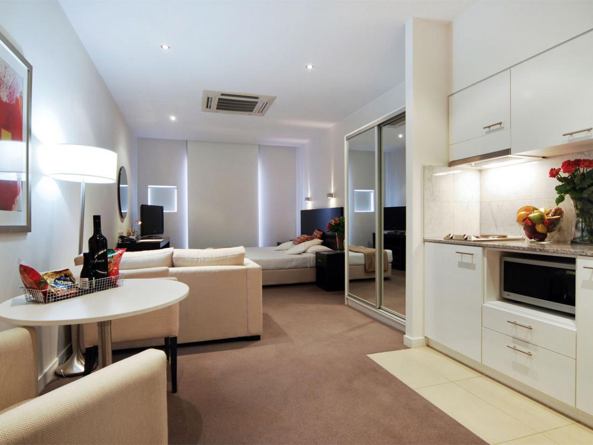 В длинных и узких помещениях можно выделить кухонную зону на одной из стен.