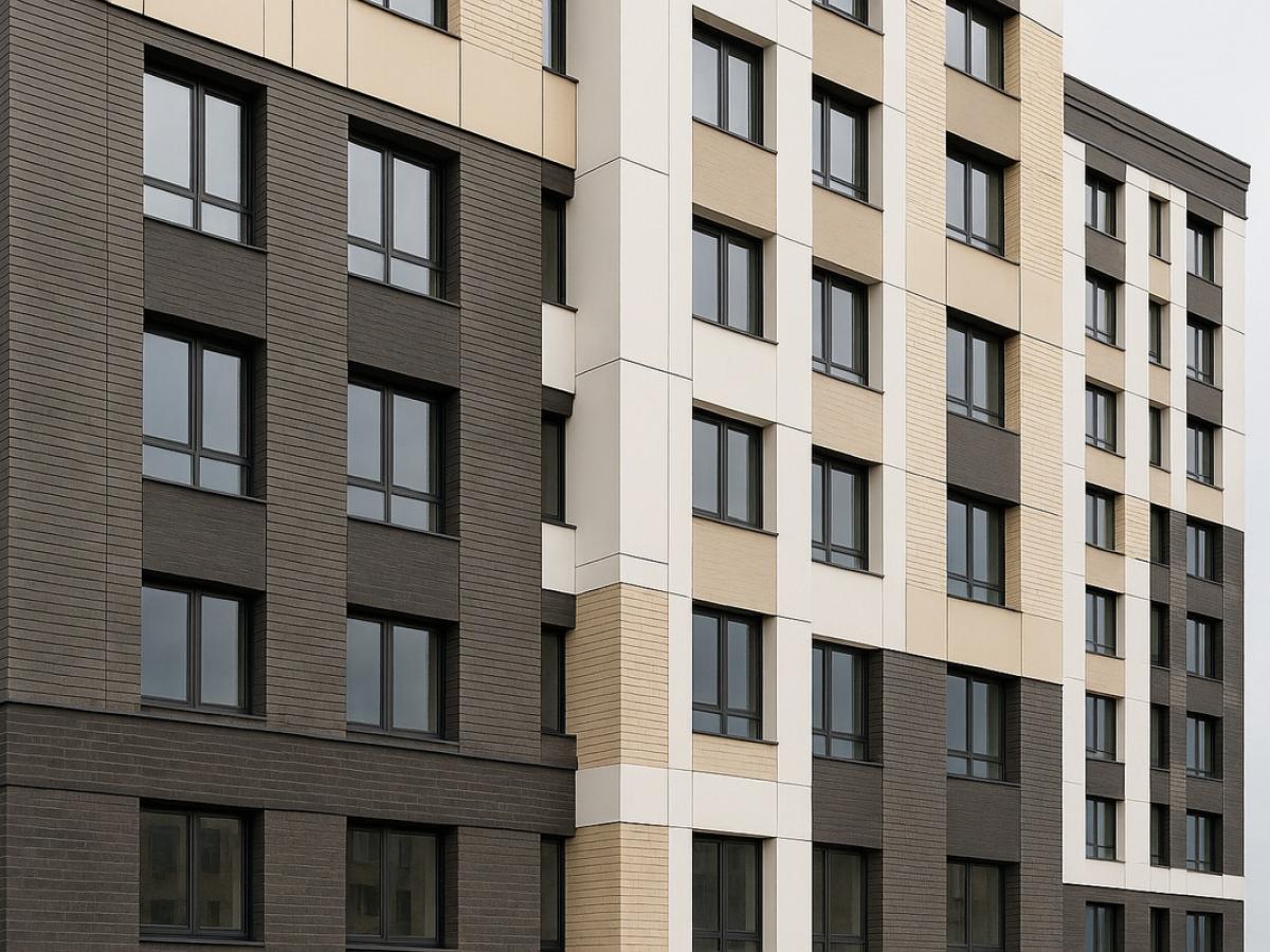 Нижняя часть фасада — самая важная. Здесь применяют дорогие, выразительные материалы, такие как натуральный камень или ручной кирпич. Средняя зона видна с уровня глаз и должна поддерживать общую стилистику, а верхняя часть (выше 9 этажа) может быть оформлена проще, с акцентом на объём и контраст, а не на детализацию.