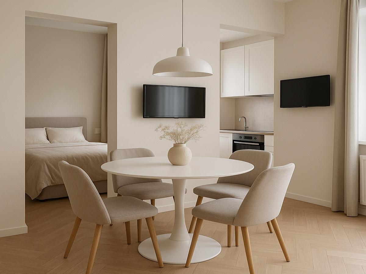 В квартире-студии круглый стол и несколько стульев поставили между окнами. Такая расстановка разграничила кухню-гостиную и спальное место без перегородок и лишней отделки.