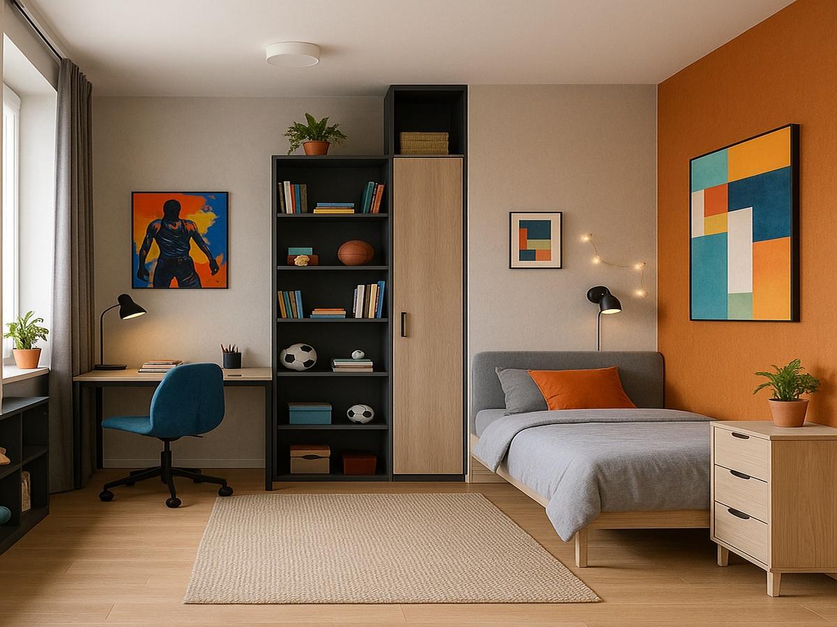 Подростку важна приватность: зонируйте комнату с помощью перегородок, штор или расстановки мебели. Минимум — спальная и учебная зоны, плюс место для хобби или встреч с друзьями.