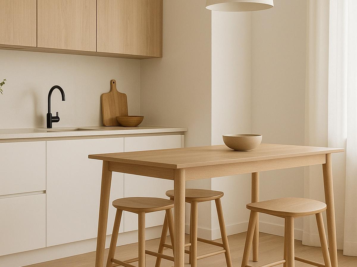 Столы с ярким декором, пастельные стулья и функциональные формы превращают кухню в место, где ностальгия встречается с практичностью.