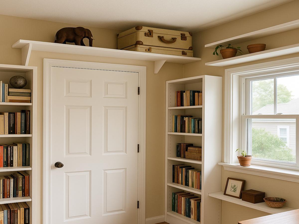 Пространство между дверью и потолком легко превращается в удобную полку. Туда можно поставить сувениры, кубки или даже чемоданы, если глубины хватит. Главное — не класть тяжелое, чтобы ничего не свалилось при сквозняке.