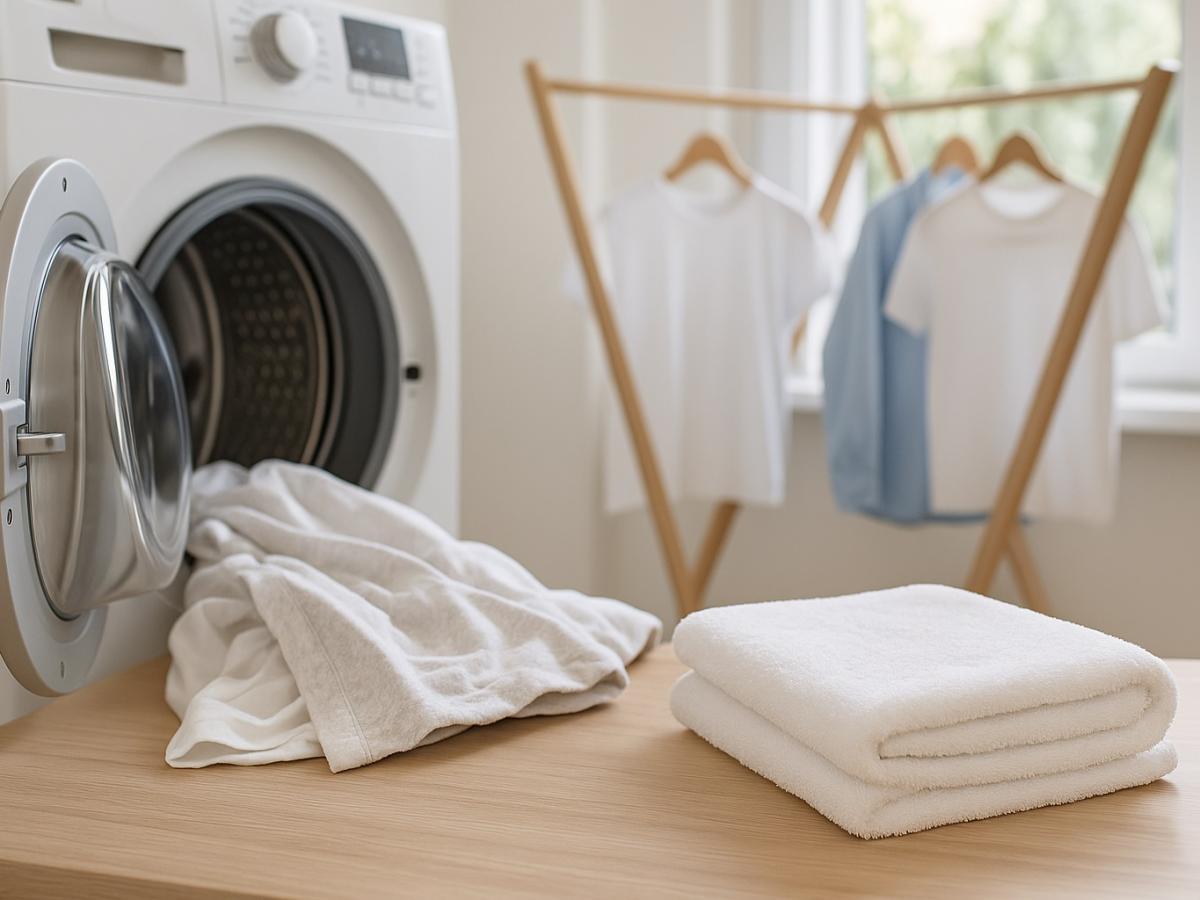 Для свежих пятен подойдет кислородный отбеливатель — он безопасен и для белых, и для светлых тканей. Хлорсодержащие средства лучше не использовать: они разрушают волокна и портят саму стиральную машину. Режим тоже играет роль: белые полотенца стирайте при 90-100°C, цветные — до 60°C.