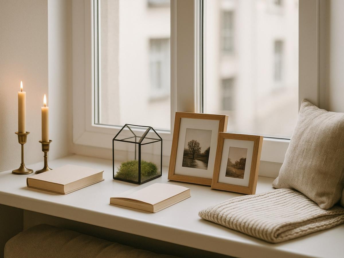 Подоконник легко превратить в семейную галерею. Фотографии в одинаковых рамках, детские рисунки или постеры добавят интерьеру индивидуальности. Их можно менять в зависимости от настроения или времени года. Для стильного эффекта рамы стоит подбирать в цвет текстиля или мебели. Хорошая альтернатива фото — вдохновляющие цитаты или абстрактные работы.