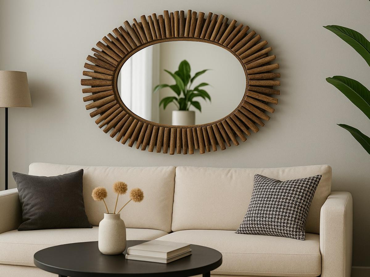 Эко-декор всегда в моде. Рама, собранная из тонких веток или аккуратных спилов дерева, создаёт атмосферу уюта и природной естественности. Такой вариант особенно удачен для интерьеров в стиле кантри или эко.