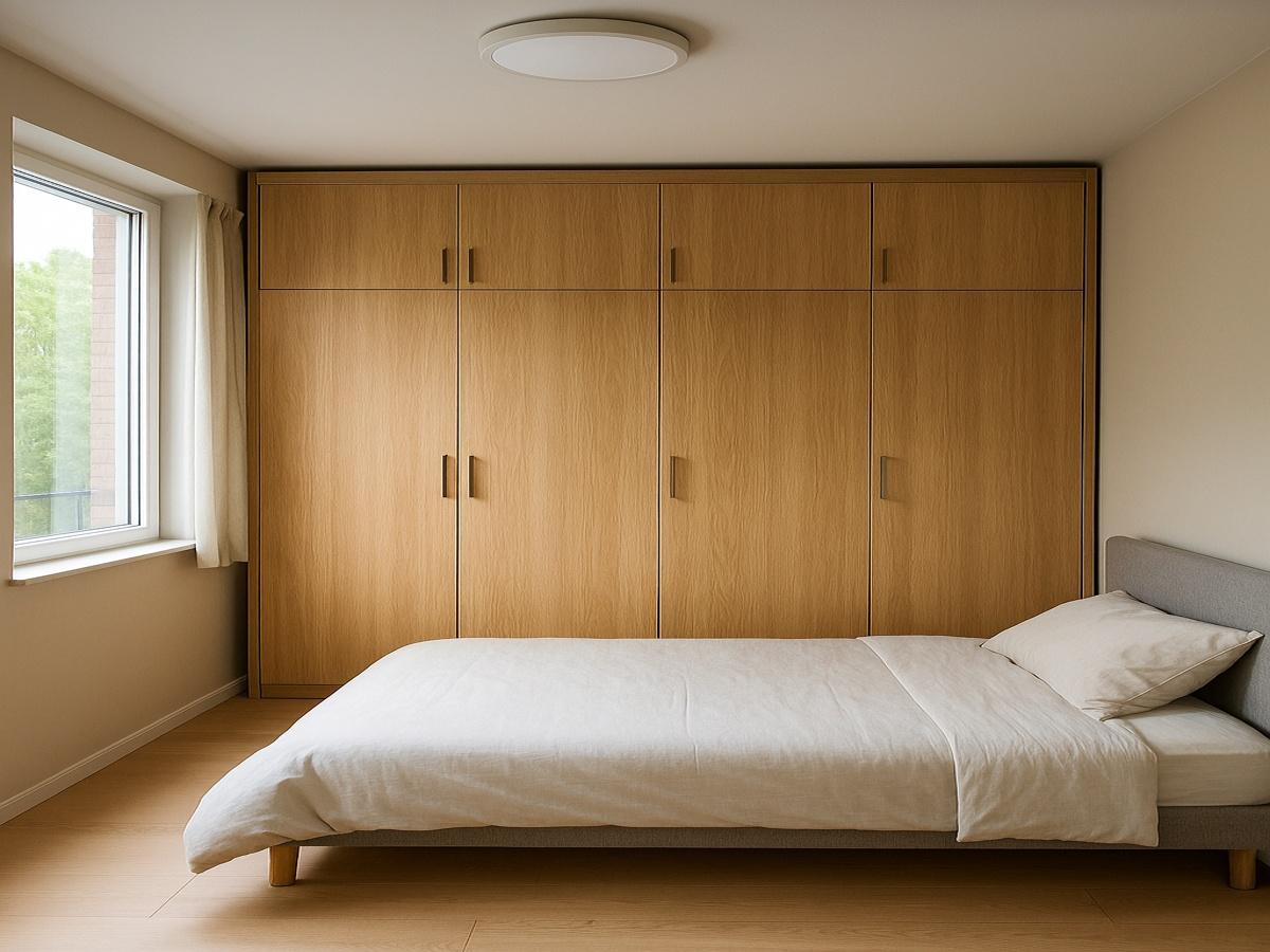 Одна из самых элегантных идей — шкаф, который "растворяется" в стене. В спальне вся длинная стена превращена в систему хранения, а фасады окрашены в тот же цвет, что и стены. Визуально шкаф не бросается в глаза, зато вместительность впечатляет.