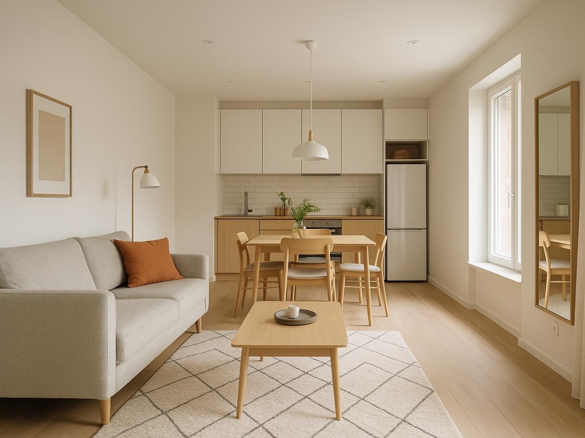 Многофункциональная мебель здесь незаменима: обеденный стол может служить рабочим местом, а диван — дополнительным спальным местом.