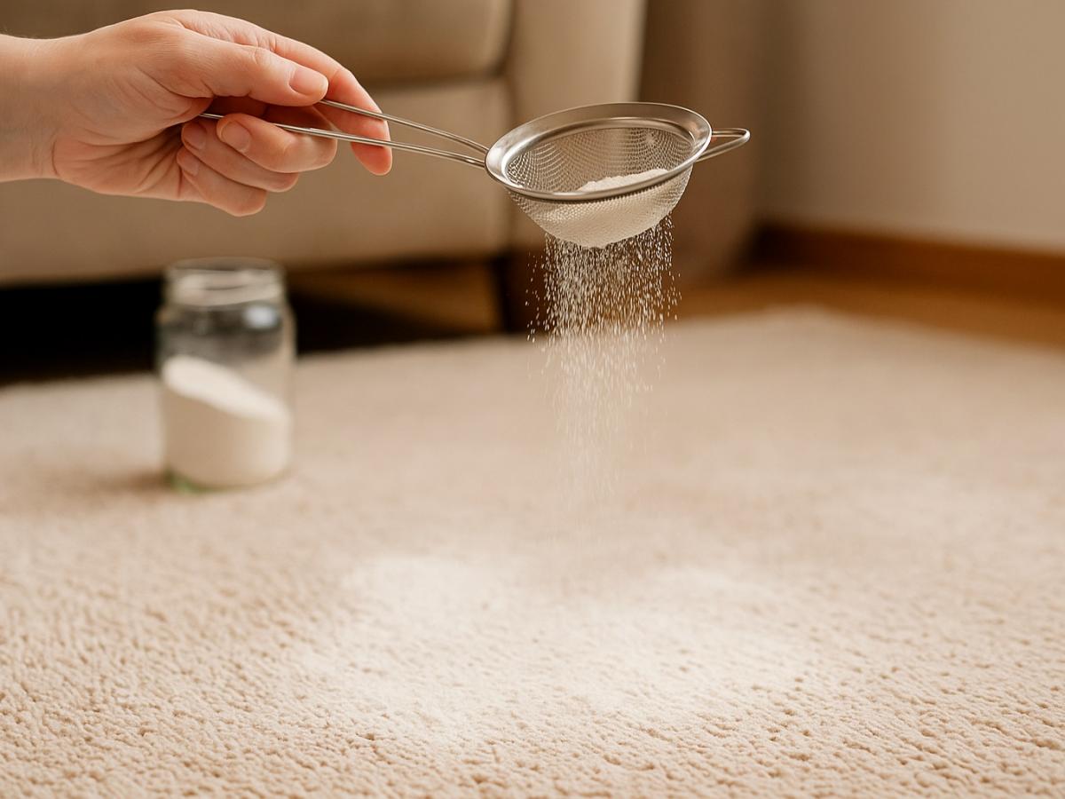 Через 20 минут сода впитает пыль, влагу и запахи, а эфирные масла начнут испаряться, наполняя дом лёгким ароматом. Остатки просто убирают пылесосом.