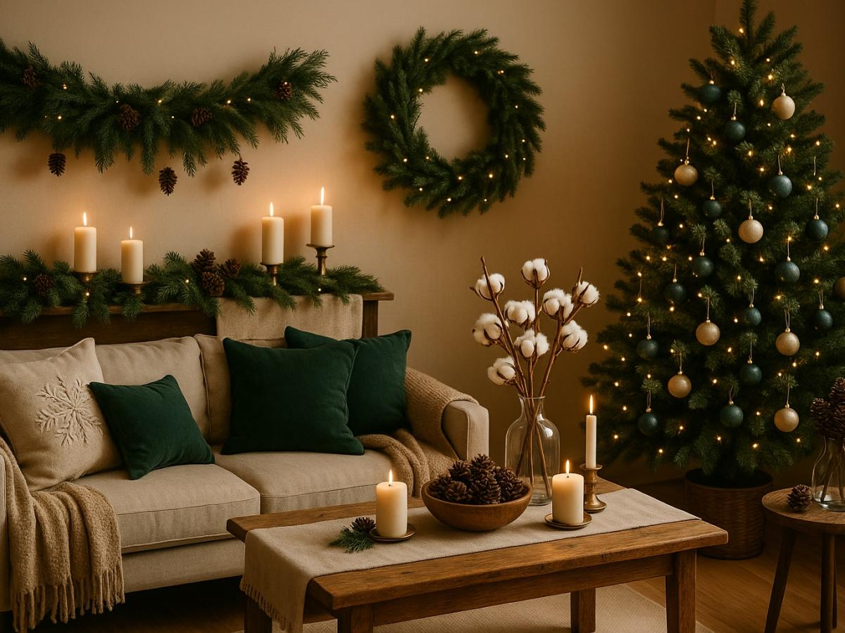 Используйте натуральные акценты: вазы с орехами, шишками, хлопком и еловыми ветками добавят аромата и природной гармонии.