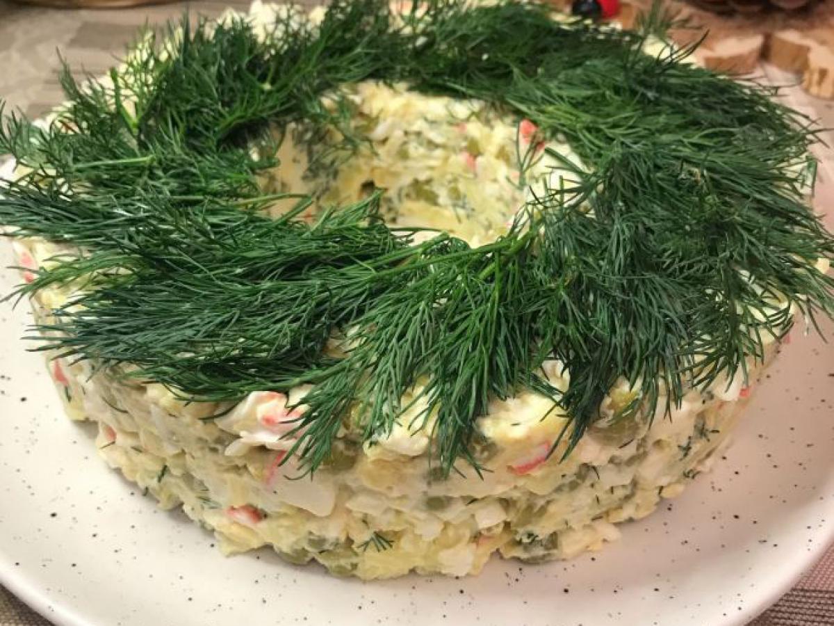 Собираем наш салатик. Крабовое мясо, оливки, картофель, яйца, горошек и укроп заправляем домашним майонезом. Все хорошо перемешиваем. А чтобы салат был не только вкусным, но и красивым — уложим его с помощью кулинарных колец, в виде венка. Выкладываем салат и сверху украшаем укропом. Он полезен для пищеварения, а зеленый цвет укропа и жёлтый цвет желтка в украшении салата порадуют великодушного ДРАКОНА — символа нового года!