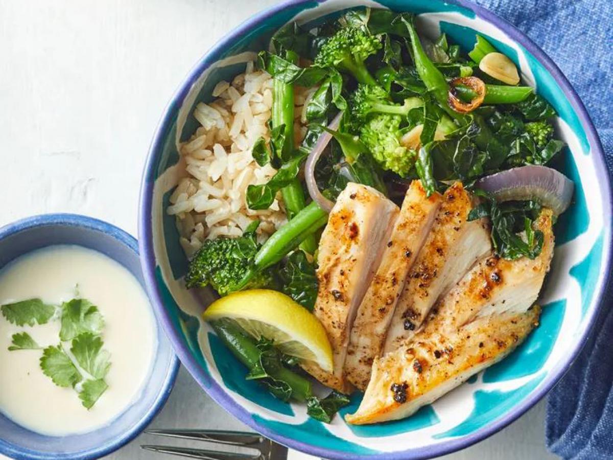 Нарежьте курицу. При подаче разложите рис и овощи по тарелкам и выложите сверху курицу. Полейте оставшейся заправкой и посыпьте кинзой.