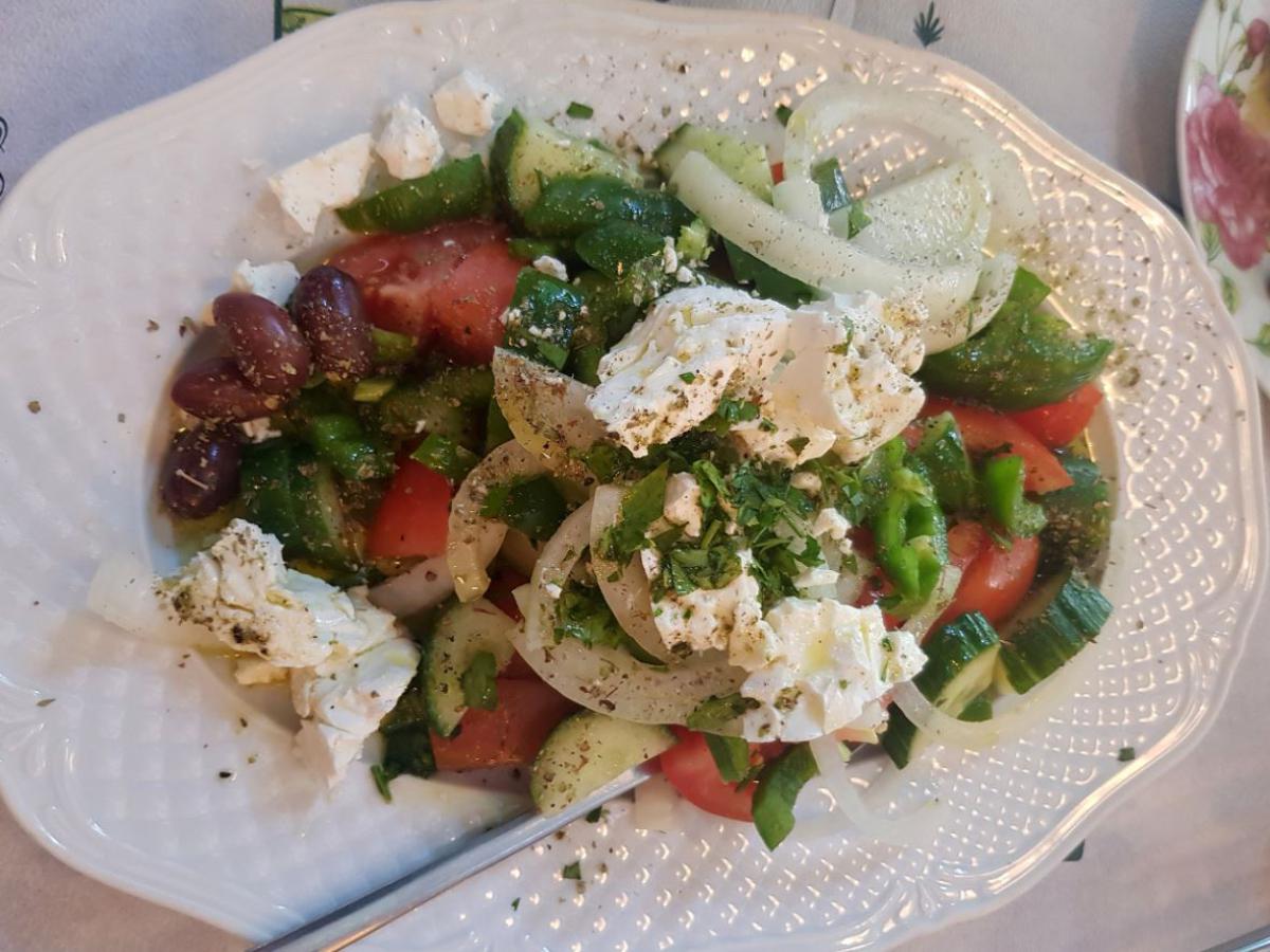 Вкусный греческий салат "Хориатики" готовится из свежих овощей с добавлением феты и чёрных маслин. Подавайте с хрустящими гренками.