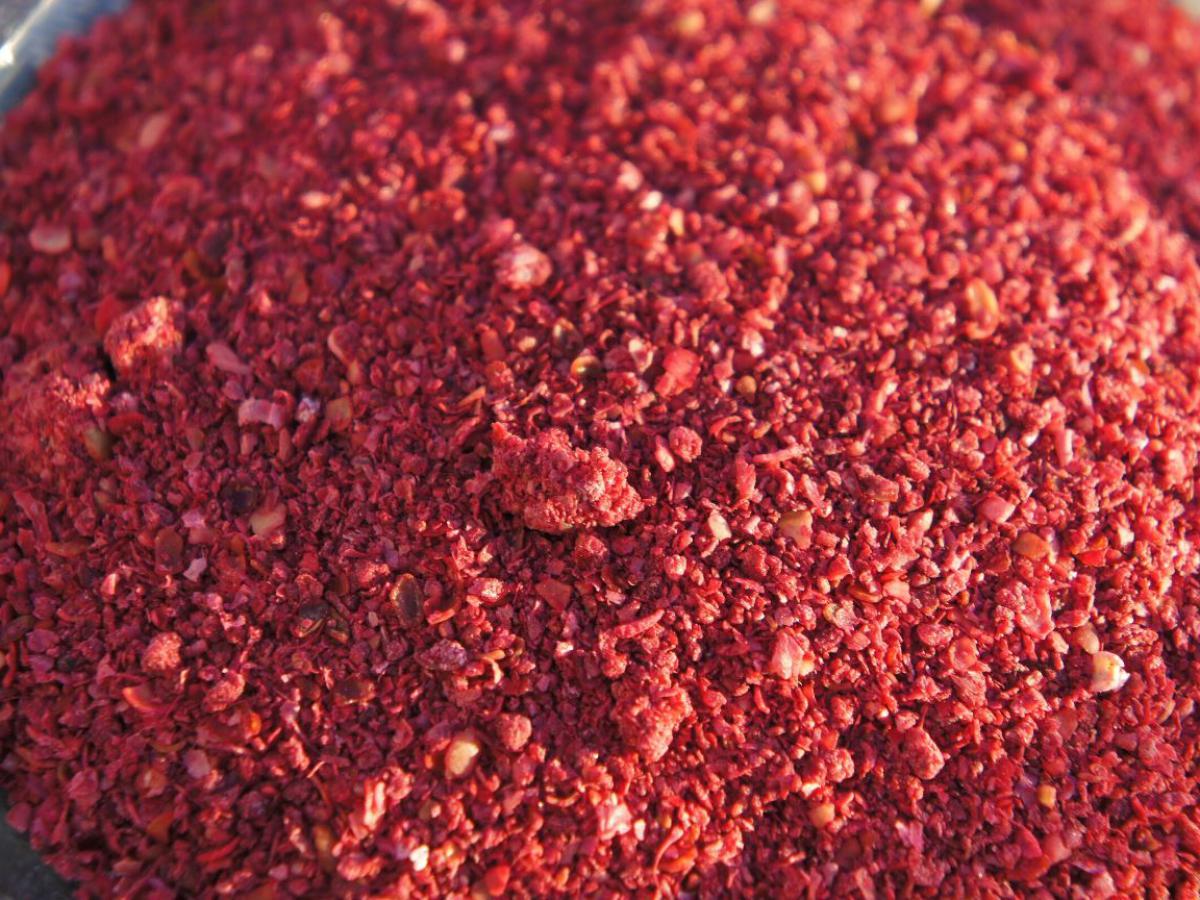 Сумах придаёт блюду яркий красный оттенок. Специя сладкая и немного терпкая, как лимонный сок, хорошо сочетается с другими специями, такими как