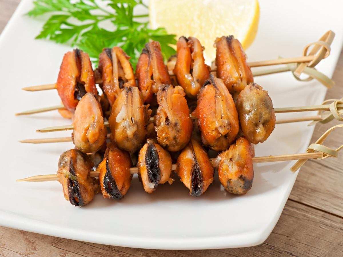 Нанизайте мидии на шпажки, уложите на решётку и обжаривайте 3-5 минут с каждой стороны, в процессе поливая маринадом.