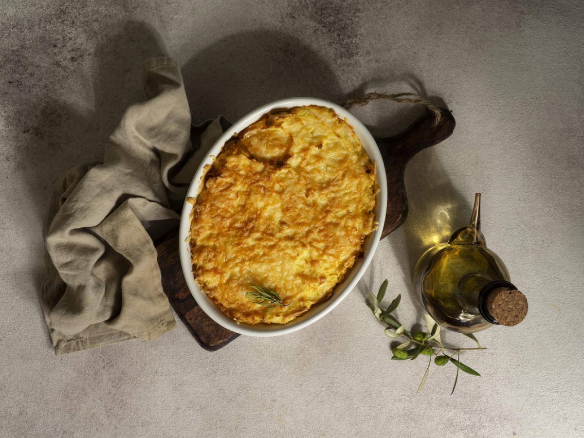 Выложите пюре в форму для запекания, сформировав бортики по краям и углубление в центре. В углубление положите начинку, посыпьте тертым сыром и запекайте в духовке 30 минут при 180 градусах.