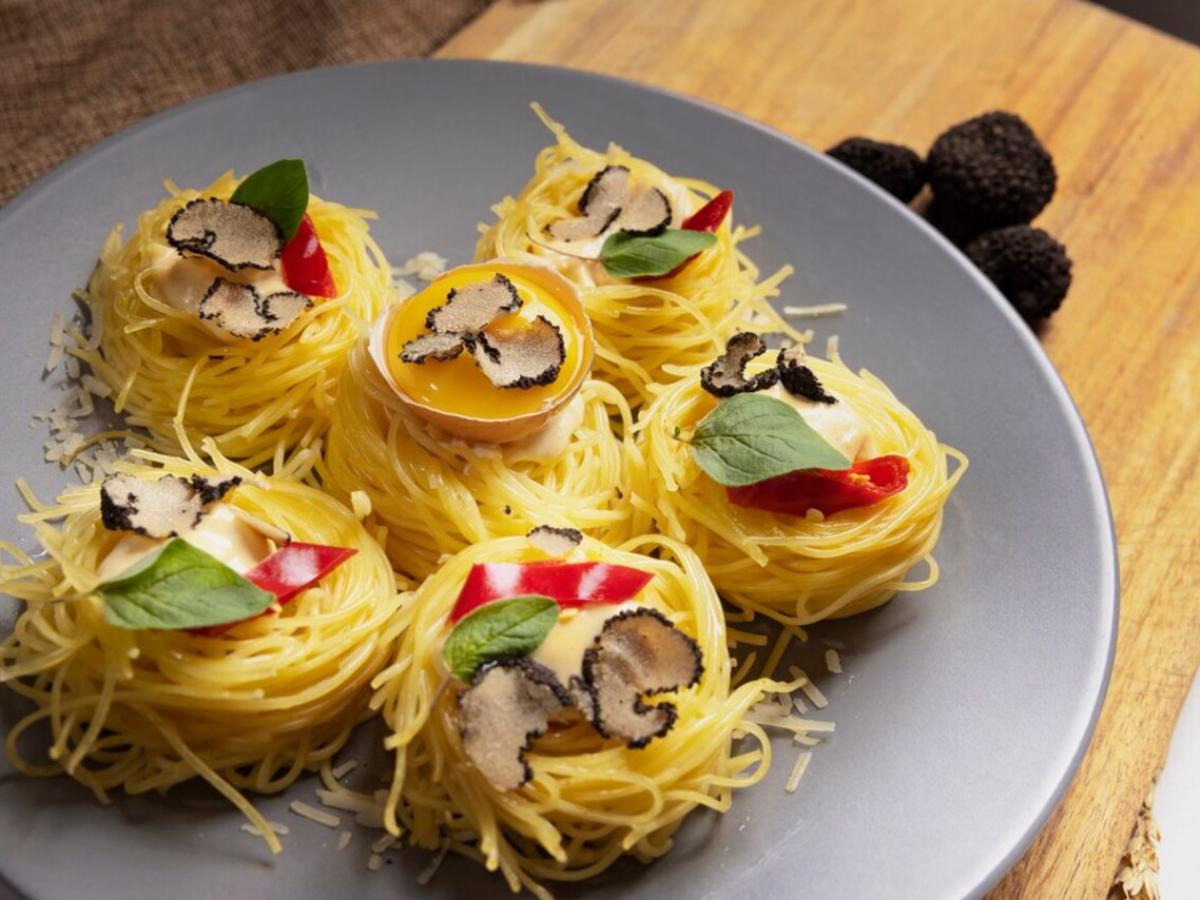Шаг 7: Возьмите форму для запекания, выложите "гнёзда" из готовой пасты, положите в каждое тефтельки и полейте их сливочным соусом.
