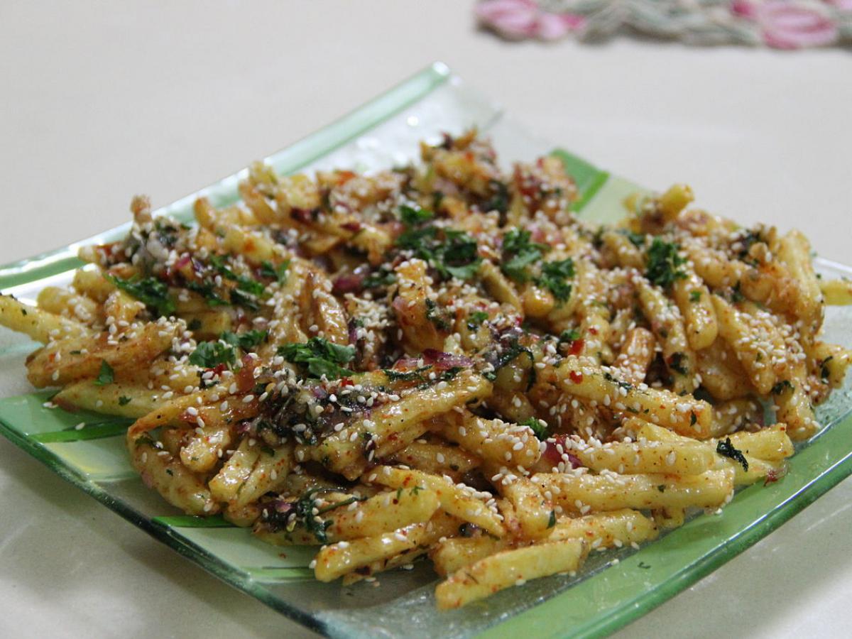 Через 2 минуты после начала жарки добавьте нарезанный брусочками картофель, хорошо перемешайте.