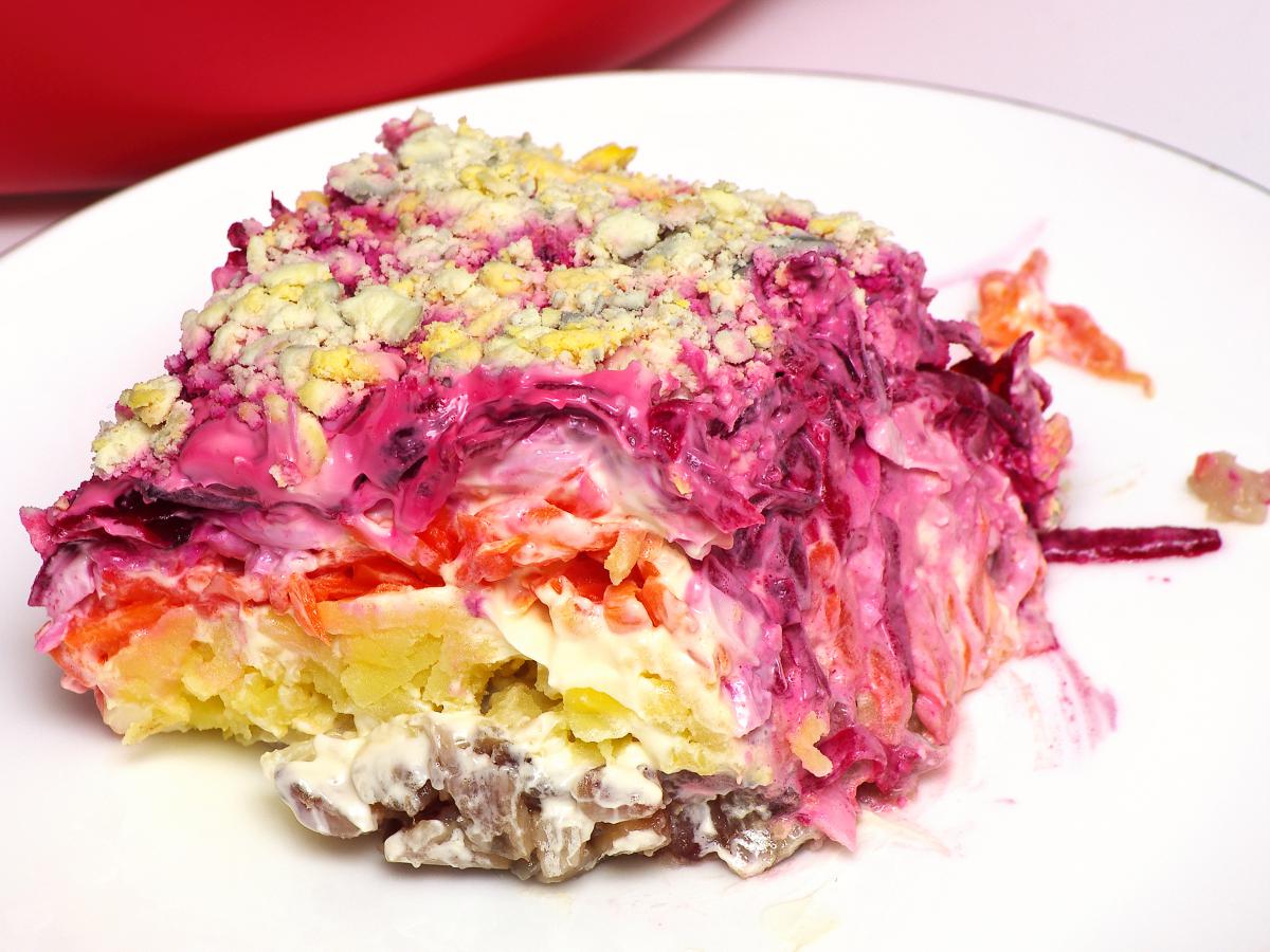 Заправьте салат, хорошо перемешайте. Масса должна стать равномерно розовой — отсюда и поэтичное название. Для подачи можно использовать кулинарное кольцо.