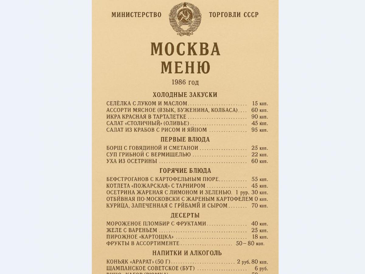 Давайте окунёмся в атмосферу настоящего советского ресторана 1986 года — с приглушённым светом, фоном ансамбля и официантами в белых пиджаках. Вот аутентичное меню : без изысков, но со статусом.