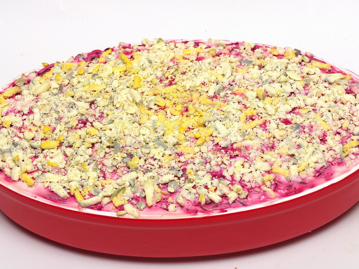 Состав: солёная сельдь, варёная свёкла, картошка, морковь, яйца и майонез.